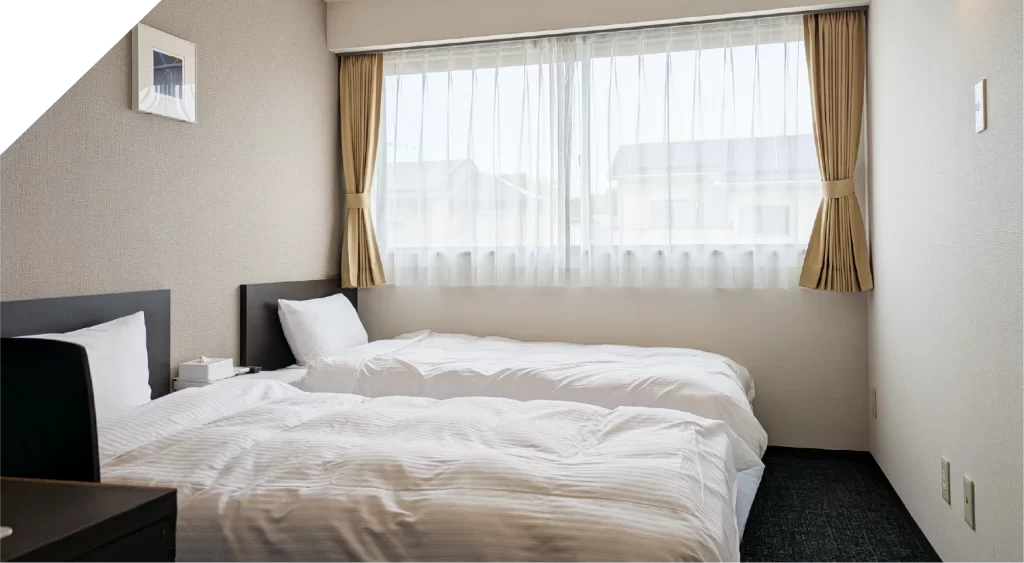 2台のベッドを配置した、機能的で使い勝手の良いお部屋。フライトや旅行前後のリラックスタイムに最適です。