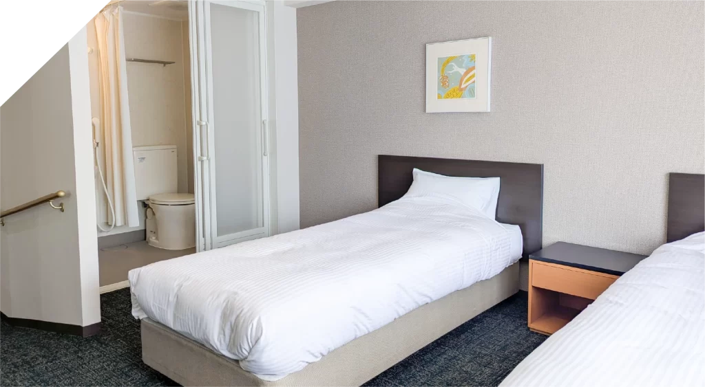 | 設備 | 冷暖房、洗面、ユニットバス(シャワーのみ)、バリアフリートイレ、冷蔵庫、テレビ、Wi-Fi、ドライヤー |